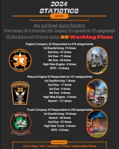 In 2024, Kentland 33 had 5,403 unit responses to 4,676 incidents, including 115 Working Fire Dispatches (WFD), the most of any Company in the county. There were 136 fire apparatus responses from Co. 33 to the 115 WFDs, but we only considered 89 of these as “fires”.