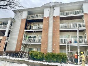 Smoke and flames pour from the balcony of a second-story apartment in a three-story brick and siding building on a snowy day. The rest of the building and surrounding area appear undamaged.